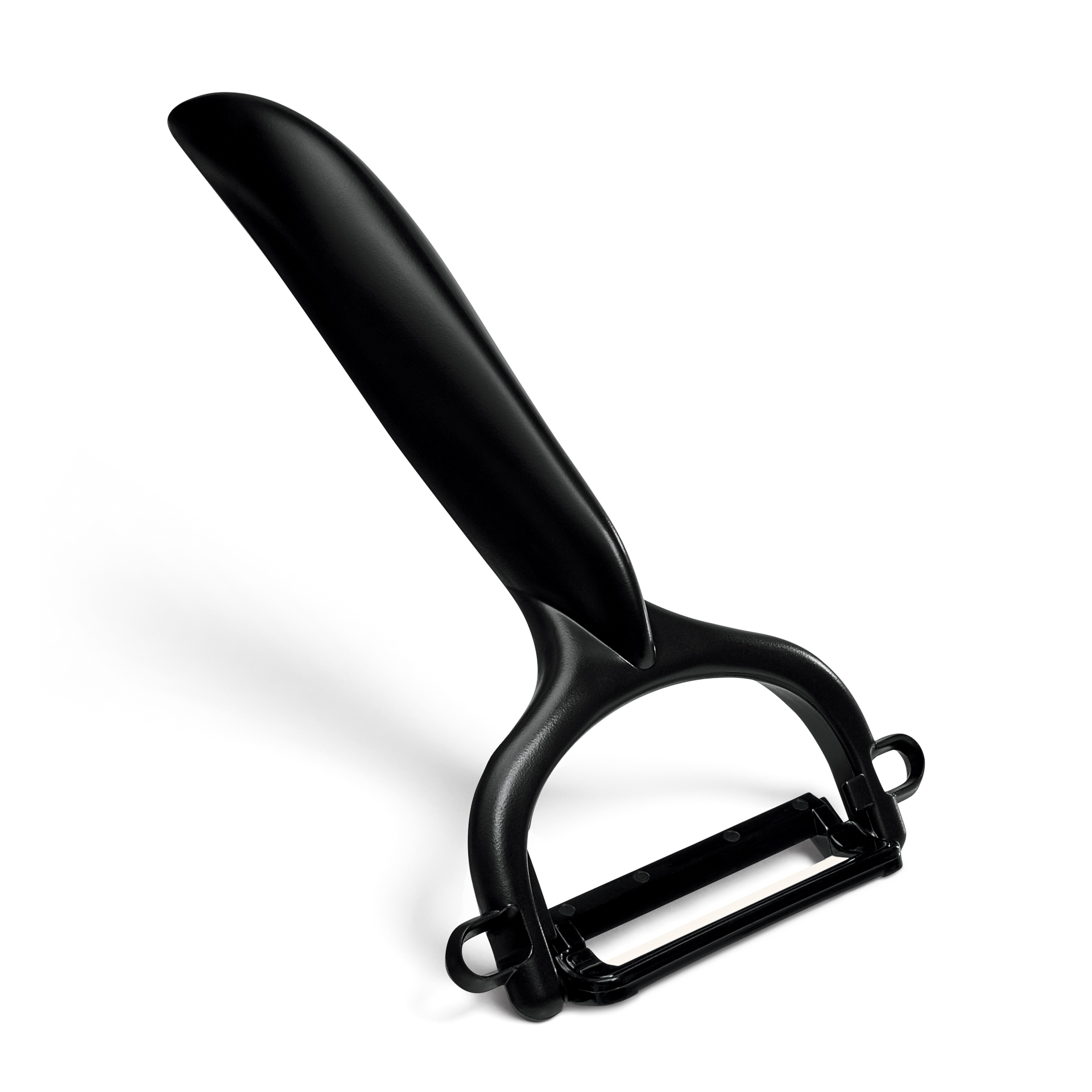 This horizontal Y peeler is the everyday essential tool for the kitchen, featuring an ultra-sharp, single-sided ceramic blade made from Kyocera's proprietary zirconia material produced in Japan and stays razor sharp at least 10 times longer than traditional peelers. The peeler is lightweight, non-corrosive, and excellent for any repetitive peeling task.
